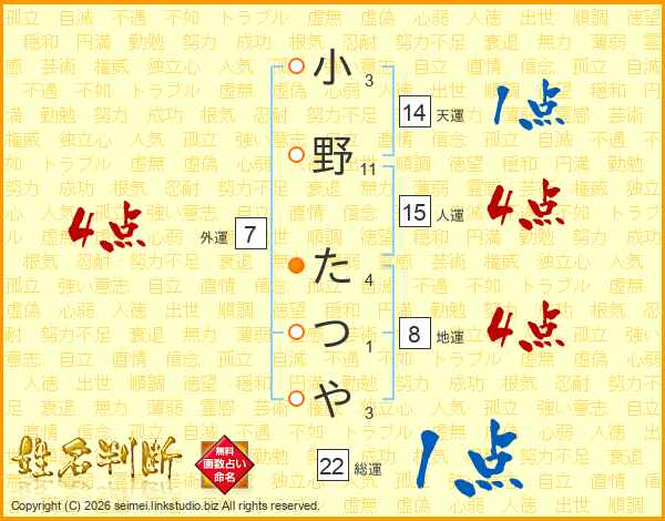 小野たつやさんの総運は22画の1点!