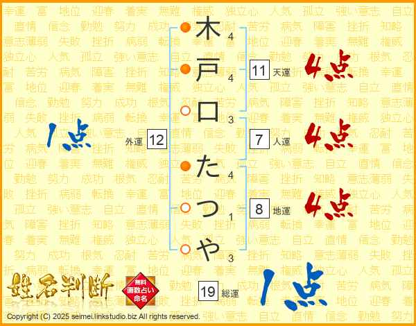 木(4画)戸(4画)口(3画) た(4画)つ(1画)や(3画)