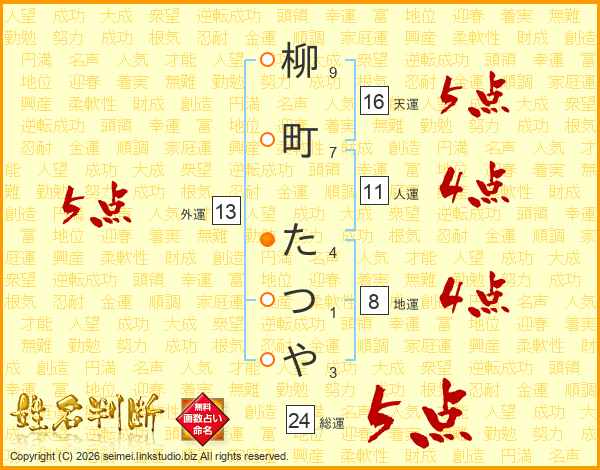柳町たつやさんの総運は24画の5点!