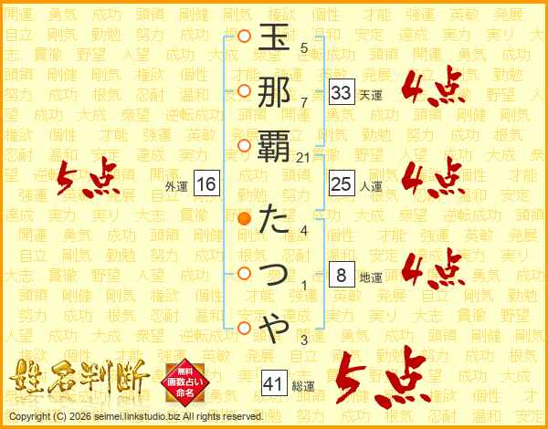 玉(5画)那(7画)覇(21画) た(4画)つ(1画)や(3画)