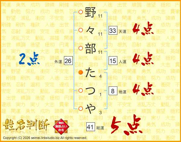 野々部たつやさんの総運は41画の5点!