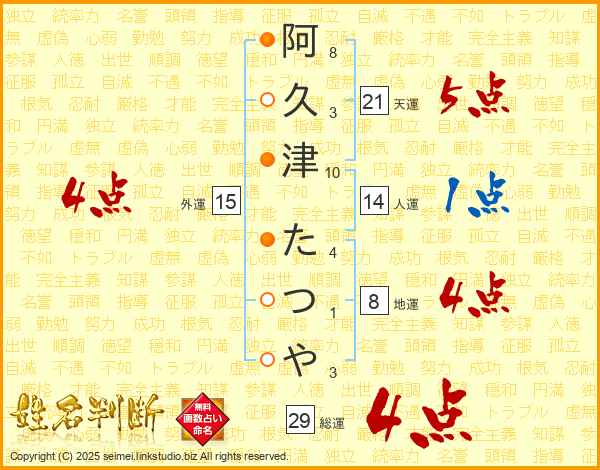 阿(8画)久(3画)津(10画) た(4画)つ(1画)や(3画)