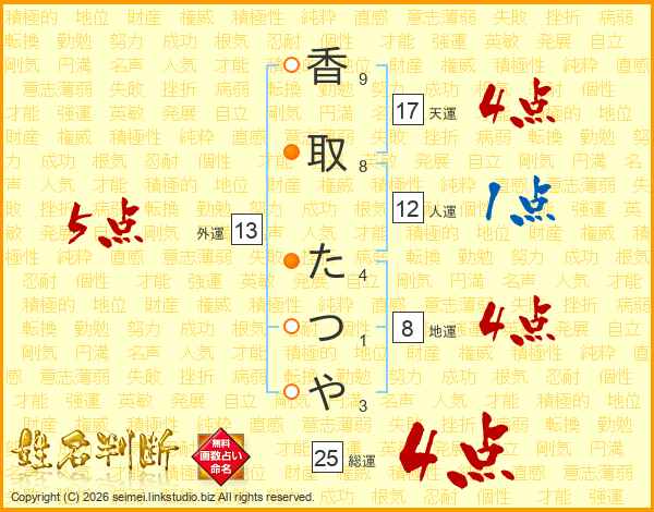 香取たつやさんの総運は25画の4点!