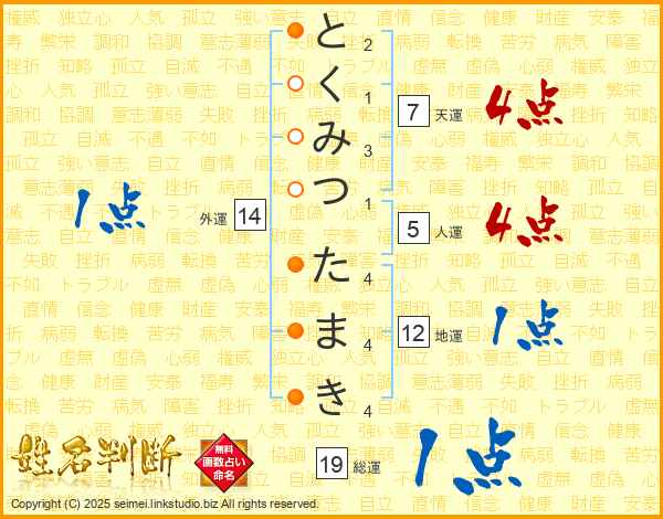 生活面を象徴する運勢です。外部から受ける影響力を表し、結婚運、家庭運や職場、環境への順応性を表します。総運から人運を引いた画数。姓や名が1文字の場合を除く。