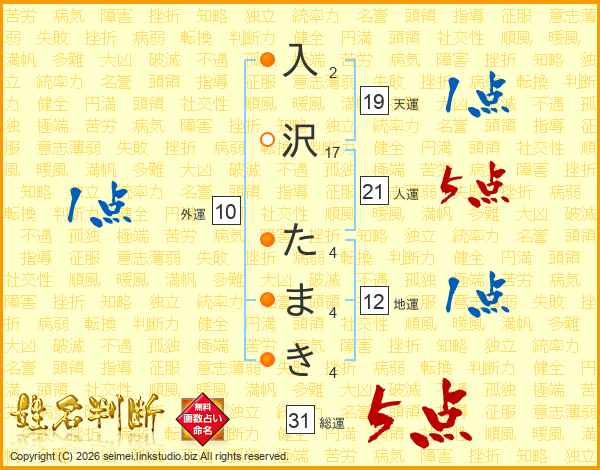 入沢たまきさんの総運は31画の5点!