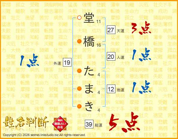 堂(11画)橋(16画) た(4画)ま(4画)き(4画)