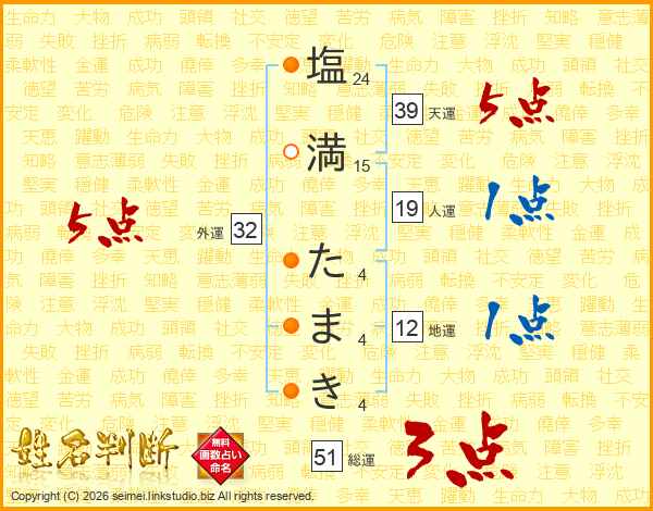 塩満たまきさんの天運は39画の5点!
