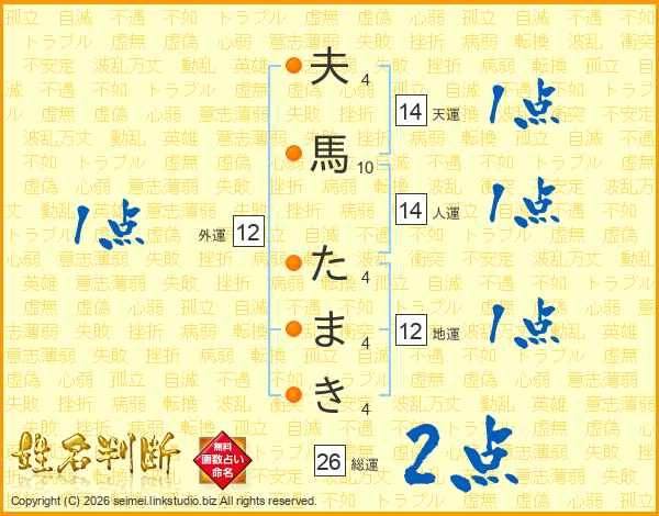 夫(4画)馬(10画) た(4画)ま(4画)き(4画)