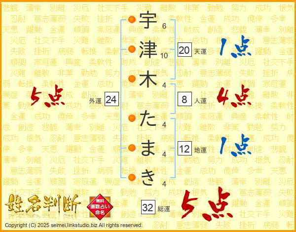 宇(6画)津(10画)木(4画) た(4画)ま(4画)き(4画)