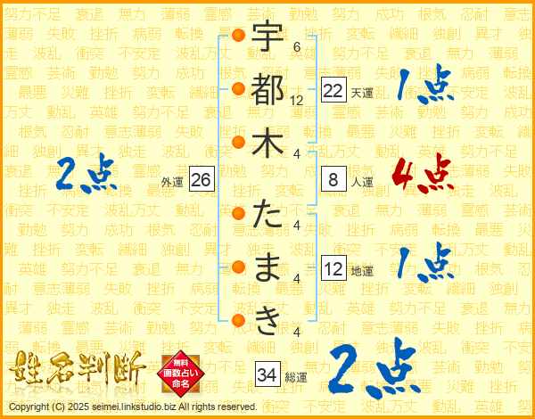 宇(6画)都(12画)木(4画) た(4画)ま(4画)き(4画)