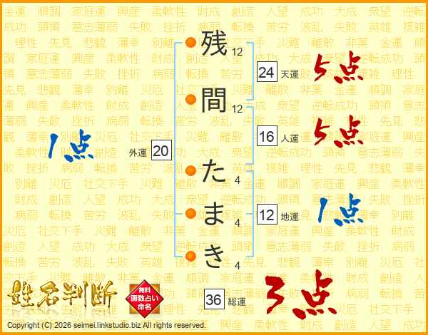残間たまきさんの総運は36画の3点!