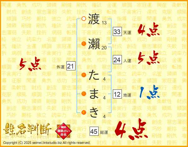 渡(13画)瀨(20画) た(4画)ま(4画)き(4画)