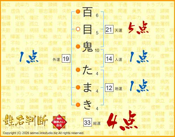 百目鬼たまきさんの総運は33画の4点!