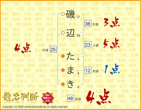 生活面を象徴する運勢です。外部から受ける影響力を表し、結婚運、家庭運や職場、環境への順応性を表します。総運から人運を引いた画数。姓や名が1文字の場合を除く。