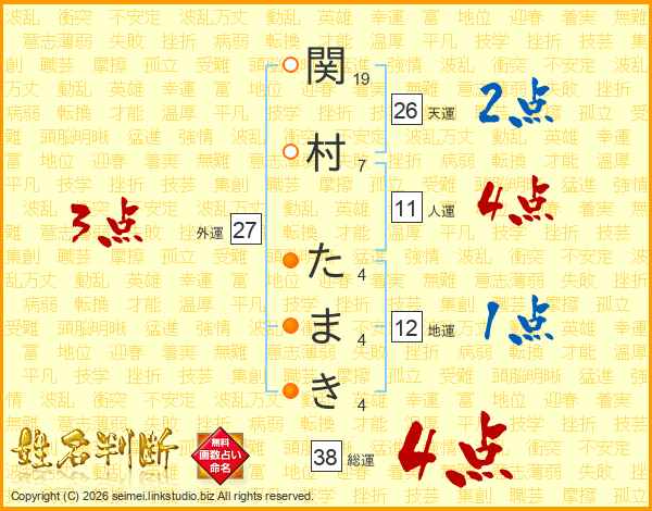 関(19画)村(7画) た(4画)ま(4画)き(4画)