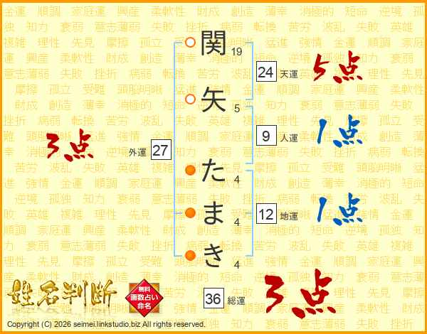 関(19画)矢(5画) た(4画)ま(4画)き(4画)