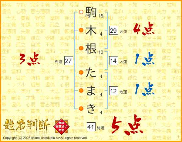駒(15画)木(4画)根(10画) た(4画)ま(4画)き(4画)