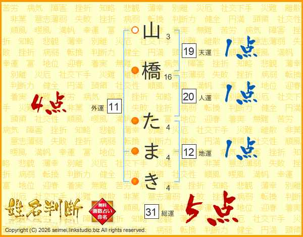 山(3画)橋(16画) た(4画)ま(4画)き(4画)