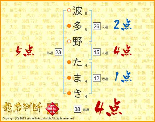 波(9画)多(6画)野(11画) た(4画)ま(4画)き(4画)