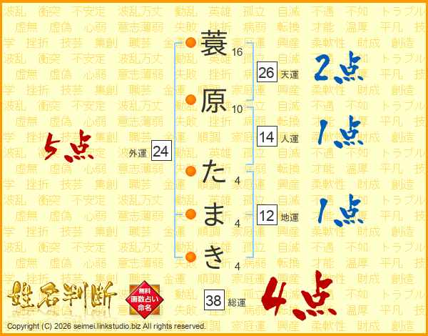 生活面を象徴する運勢です。外部から受ける影響力を表し、結婚運、家庭運や職場、環境への順応性を表します。総運から人運を引いた画数。姓や名が1文字の場合を除く。