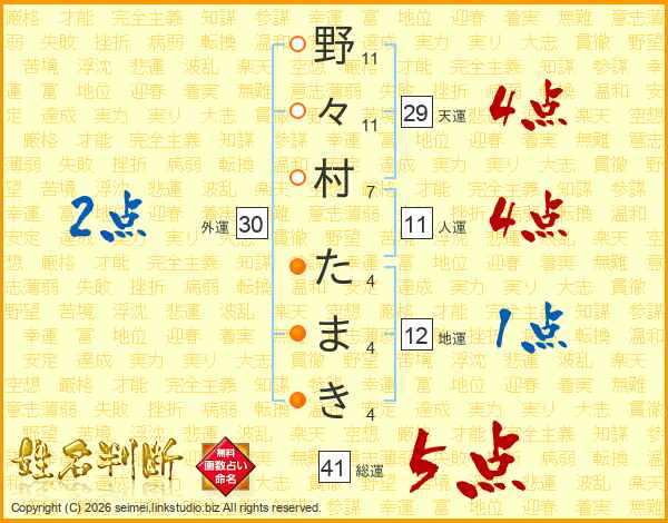 野(11画)々(11画)村(7画) た(4画)ま(4画)き(4画)