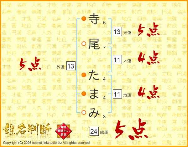 寺(6画)尾(7画) た(4画)ま(4画)み(3画)