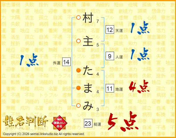 村(7画)主(5画) た(4画)ま(4画)み(3画)