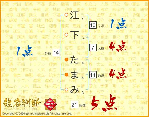 江(7画)下(3画) た(4画)ま(4画)み(3画)