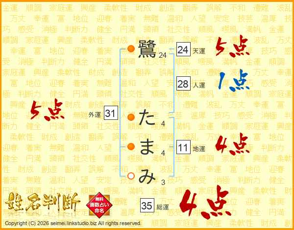 生活面を象徴する運勢です。外部から受ける影響力を表し、結婚運、家庭運や職場、環境への順応性を表します。総運から人運を引いた画数。姓や名が1文字の場合を除く。