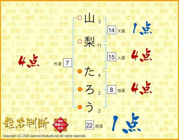 生活面を象徴する運勢です。外部から受ける影響力を表し、結婚運、家庭運や職場、環境への順応性を表します。総運から人運を引いた画数。姓や名が1文字の場合を除く。