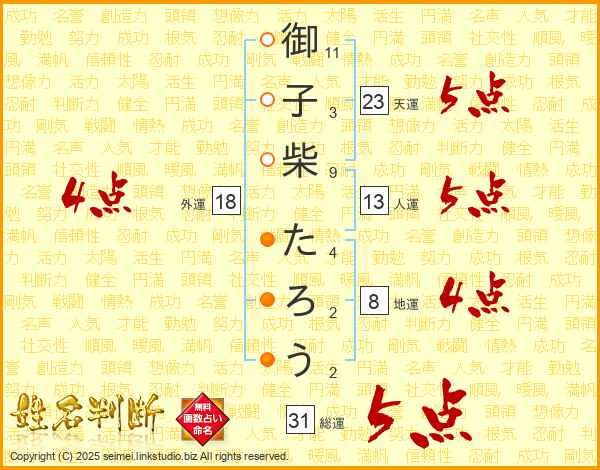 御(11画)子(3画)柴(9画) た(4画)ろ(2画)う(2画)