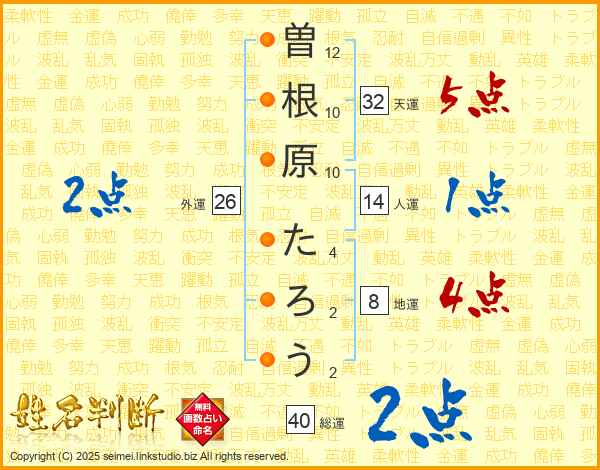 曽(12画)根(10画)原(10画) た(4画)ろ(2画)う(2画)