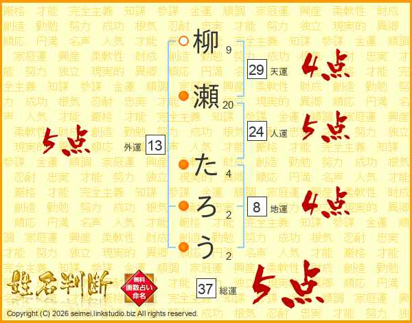 柳瀬たろうさんの総運は37画の5点!