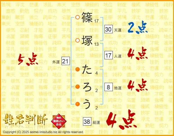 生活面を象徴する運勢です。外部から受ける影響力を表し、結婚運、家庭運や職場、環境への順応性を表します。総運から人運を引いた画数。姓や名が1文字の場合を除く。