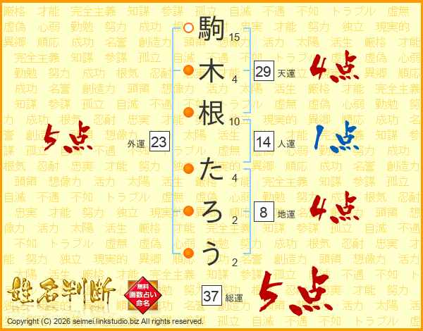 駒(15画)木(4画)根(10画) た(4画)ろ(2画)う(2画)