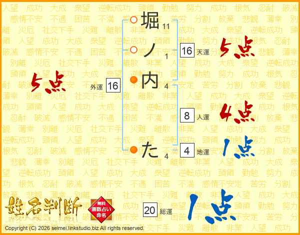 生活面を象徴する運勢です。外部から受ける影響力を表し、結婚運、家庭運や職場、環境への順応性を表します。総運から人運を引いた画数。姓や名が1文字の場合を除く。