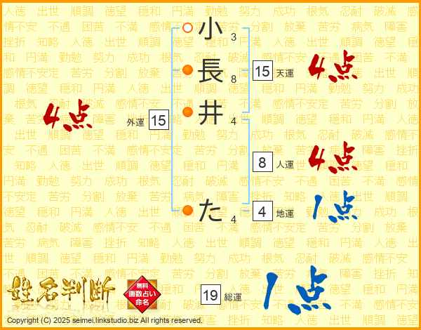 生活面を象徴する運勢です。外部から受ける影響力を表し、結婚運、家庭運や職場、環境への順応性を表します。総運から人運を引いた画数。姓や名が1文字の場合を除く。