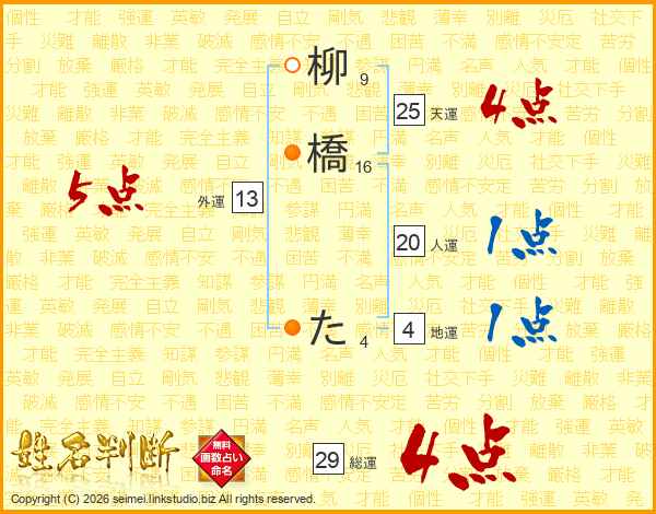 柳橋たさんの総運は29画の4点!