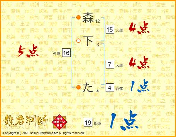 生活面を象徴する運勢です。外部から受ける影響力を表し、結婚運、家庭運や職場、環境への順応性を表します。総運から人運を引いた画数。姓や名が1文字の場合を除く。