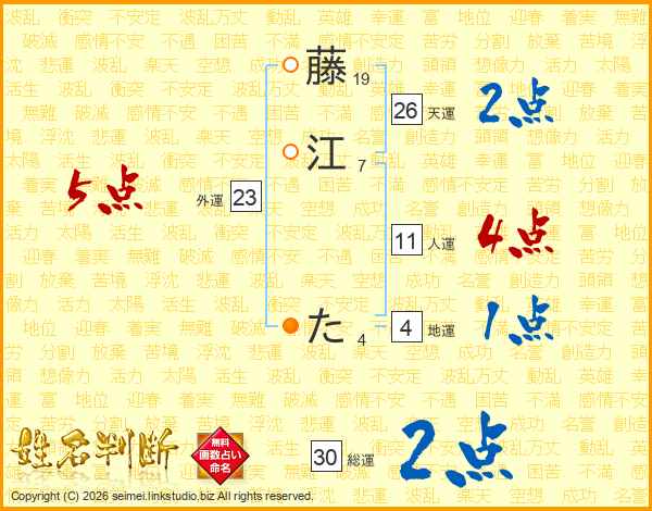 生活面を象徴する運勢です。外部から受ける影響力を表し、結婚運、家庭運や職場、環境への順応性を表します。総運から人運を引いた画数。姓や名が1文字の場合を除く。