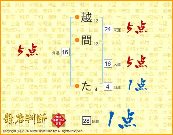 越間たさんの人運は16画の5点!