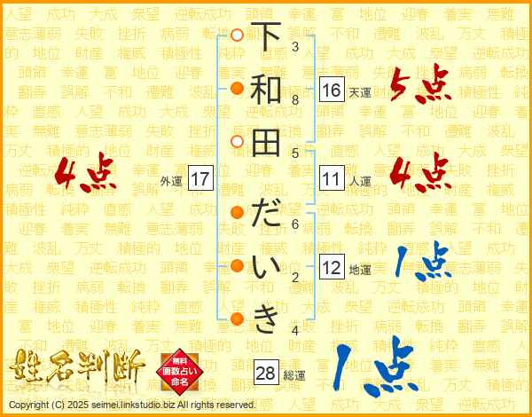 生活面を象徴する運勢です。外部から受ける影響力を表し、結婚運、家庭運や職場、環境への順応性を表します。総運から人運を引いた画数。姓や名が1文字の場合を除く。
