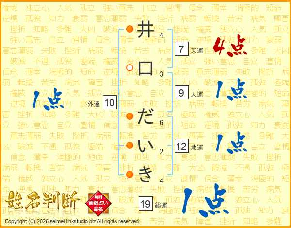 あなたの人生を表す1番重要な運勢です。生涯を通じて影響する総合運となり、主に50歳以降の晩年期に影響を及ぼします。苗字と名前の合計画数。