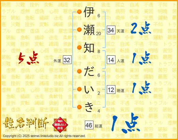 伊(6画)瀬(20画)知(8画) だ(6画)い(2画)き(4画)