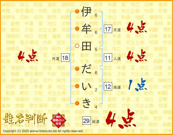 伊(6画)牟(6画)田(5画) だ(6画)い(2画)き(4画)