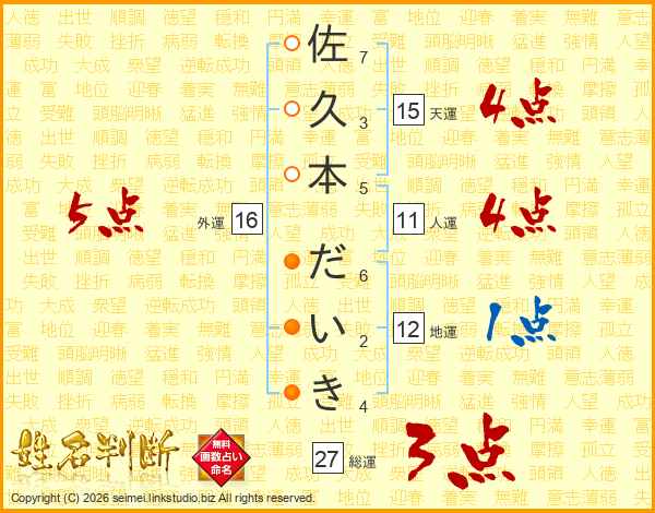 佐(7画)久(3画)本(5画) だ(6画)い(2画)き(4画)
