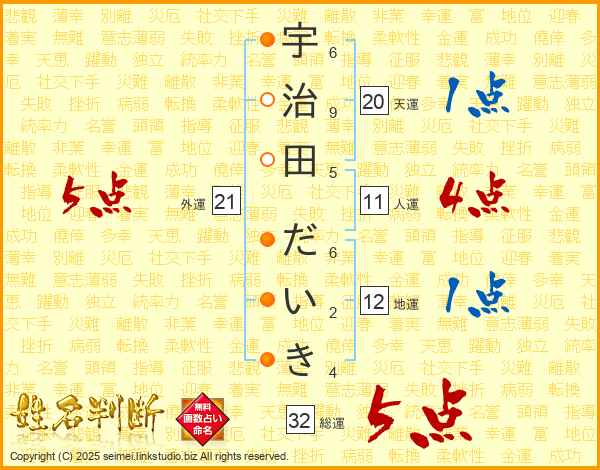 宇(6画)治(9画)田(5画) だ(6画)い(2画)き(4画)