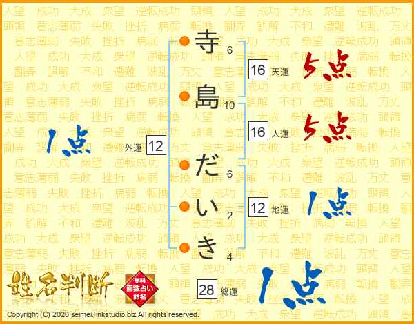 寺島だいきさんの総運は28画の1点!