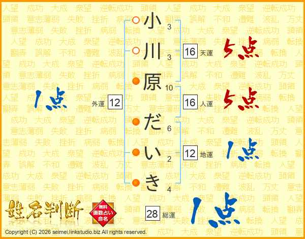 生活面を象徴する運勢です。外部から受ける影響力を表し、結婚運、家庭運や職場、環境への順応性を表します。総運から人運を引いた画数。姓や名が1文字の場合を除く。