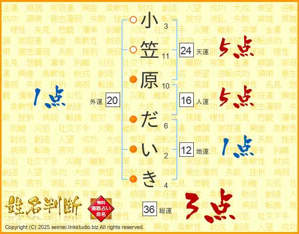 生活面を象徴する運勢です。外部から受ける影響力を表し、結婚運、家庭運や職場、環境への順応性を表します。総運から人運を引いた画数。姓や名が1文字の場合を除く。